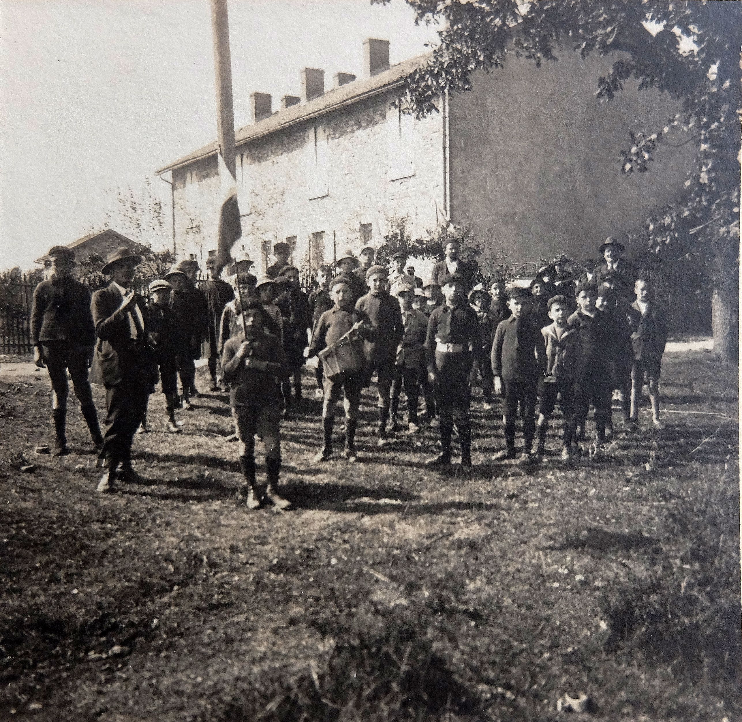 enfants, avec une même tenue. Des jumeaux ? Un drapeau flotte...