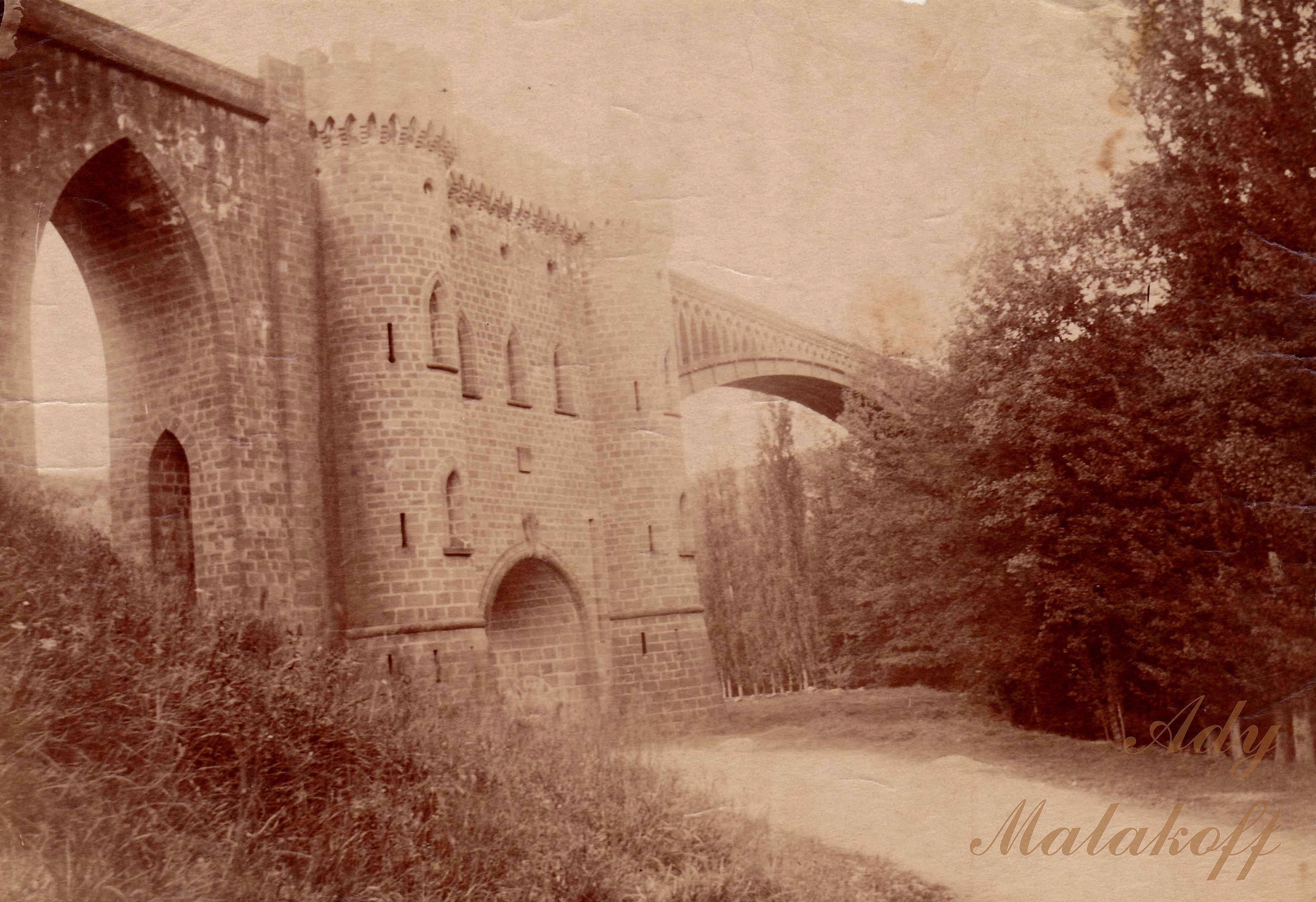 « la voie se tenant toujours sur la rive droite de la vallée, s’élève en rampe de 0,015, décrivant une série non interrompue de courbes, à cause des nombreux replis de l’escarpement. Depuis Saint-Christophe, au-dessous de la ligne sur laquelle nous voyageons, se développe parallèlement une voie ferrée construite par la Compagnie de Decazeville. Elle va de Marcillac à cette usine, en passant par Saint Christophe et Firmy. Sa longueur totale est de 21 kilomètres : savoir 5 de Marcillac à Saint Christophe, 12 de Saint Christophe à Firmy et 4 de Firmy à Decazeville. Elle sert à transporter à cette usine les minerais de Mondalazac et les autres matières premières qu’elle rencontre sur son parcours. Elle traverse 9 tunnels formant une longueur totale de 3 200 mètres ; celui de Marcillac en a 950 et celui de Riou Nègre 1 050. Elle a nécessité la construction de deux viaducs et d'un pont américain. Le premier viaduc placé à Marcillac est composé de 15 arches ; il a une longueur totale de 150 mètres. Le second est celui dit de Malakoff, que nous apercevons sur la gauche avant d'arriver à Marcillac. Les deux culées, construites en grès rouge affectent la forme de deux tours ; à l'intérieur règne un escalier qui permet de s'élever jusqu'à la plate-forme et qu’éclairent des meurtrières ; le sommet est couronné de mâchicoulis et de créneaux. L’arche principale a 44 mètres de longueur; elle repose sur deux immenses arcs de fer. Le tympan est en maçonnerie, affectant la forme d'ogives croisées qui donnent à l'ensemble un cachet féodal. La hauteur, au-dessus du torrent, est de 22 mètres. M. Cabrol, directeur de Decazeville, qui a donné les plans de ce viaduc, a voulu faire l'essai d'un nouveau mode de construction en combinant habilement le fer et la maçonnerie. Quant au nom, le peuple le lui a donné après la guerre de Crimée. La longueur totale du viaduc est de près de 150 mètres.