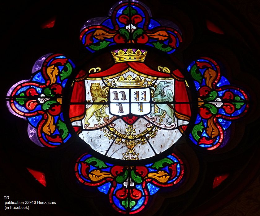 Eglise de Bonzac. Vitrail, couronnes de duc et duc et pair