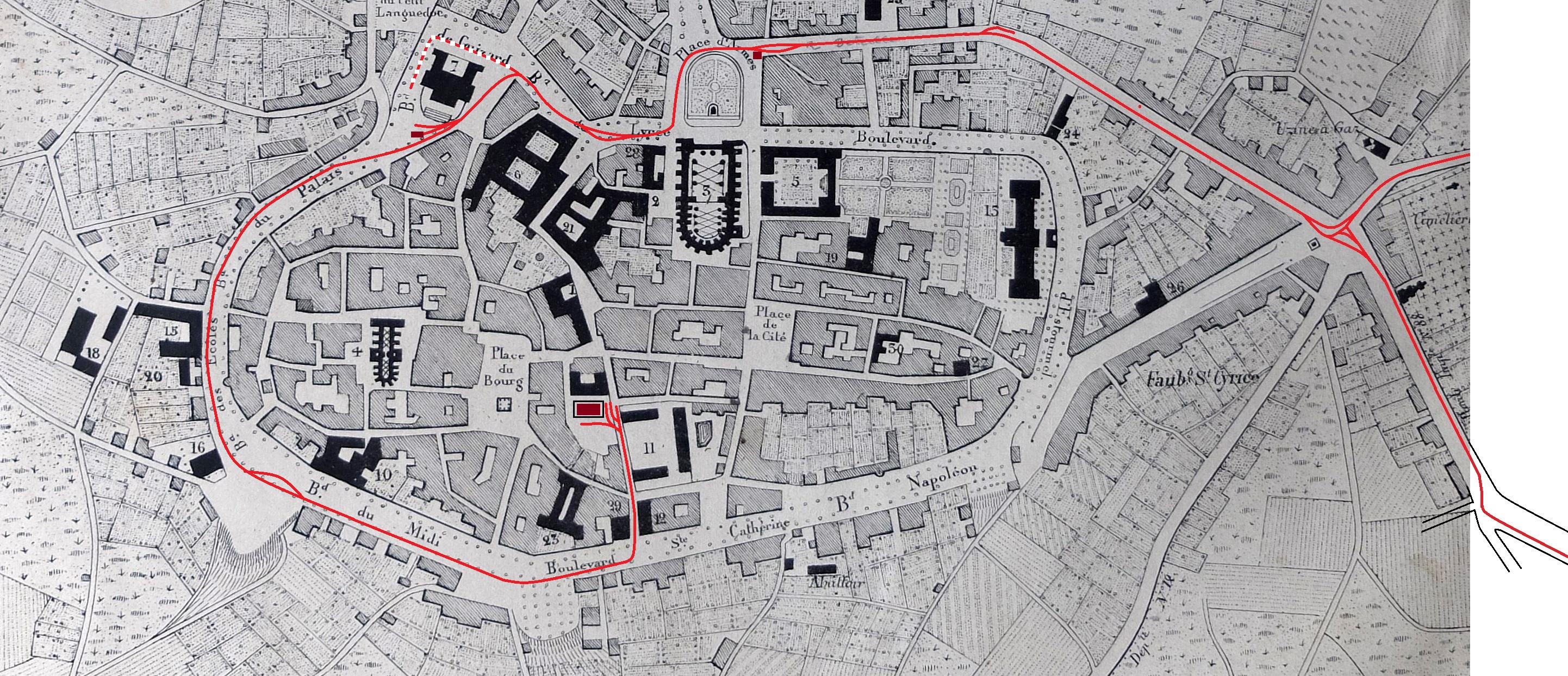 ▼Partie urbaine, report du tracé* sur plan Romain de 1856